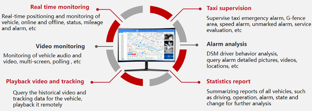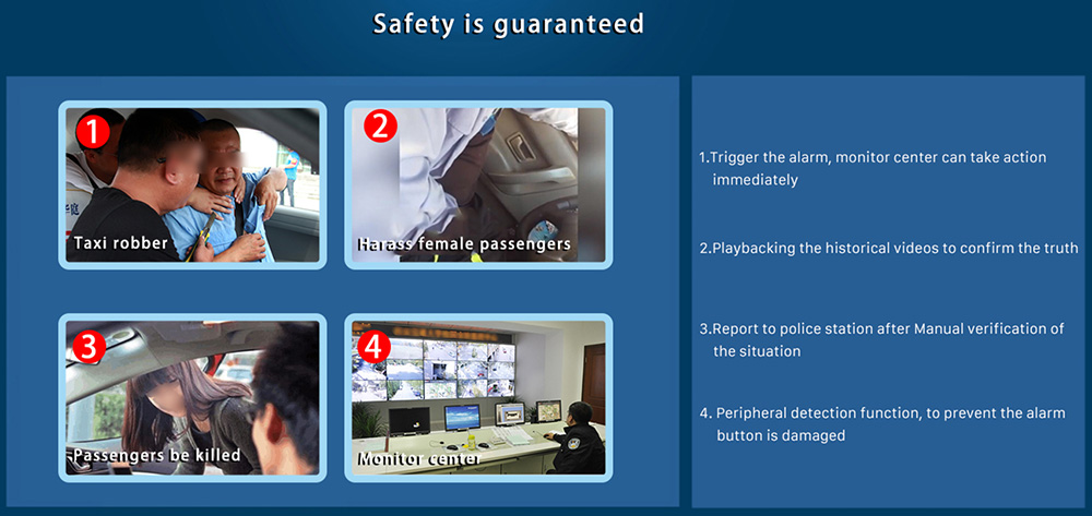 Having such powerful surveillance system, the management department and monitor center can locate all Taxis in real time, see what happened on the Taxi and behaviors of the drivers and passengers.